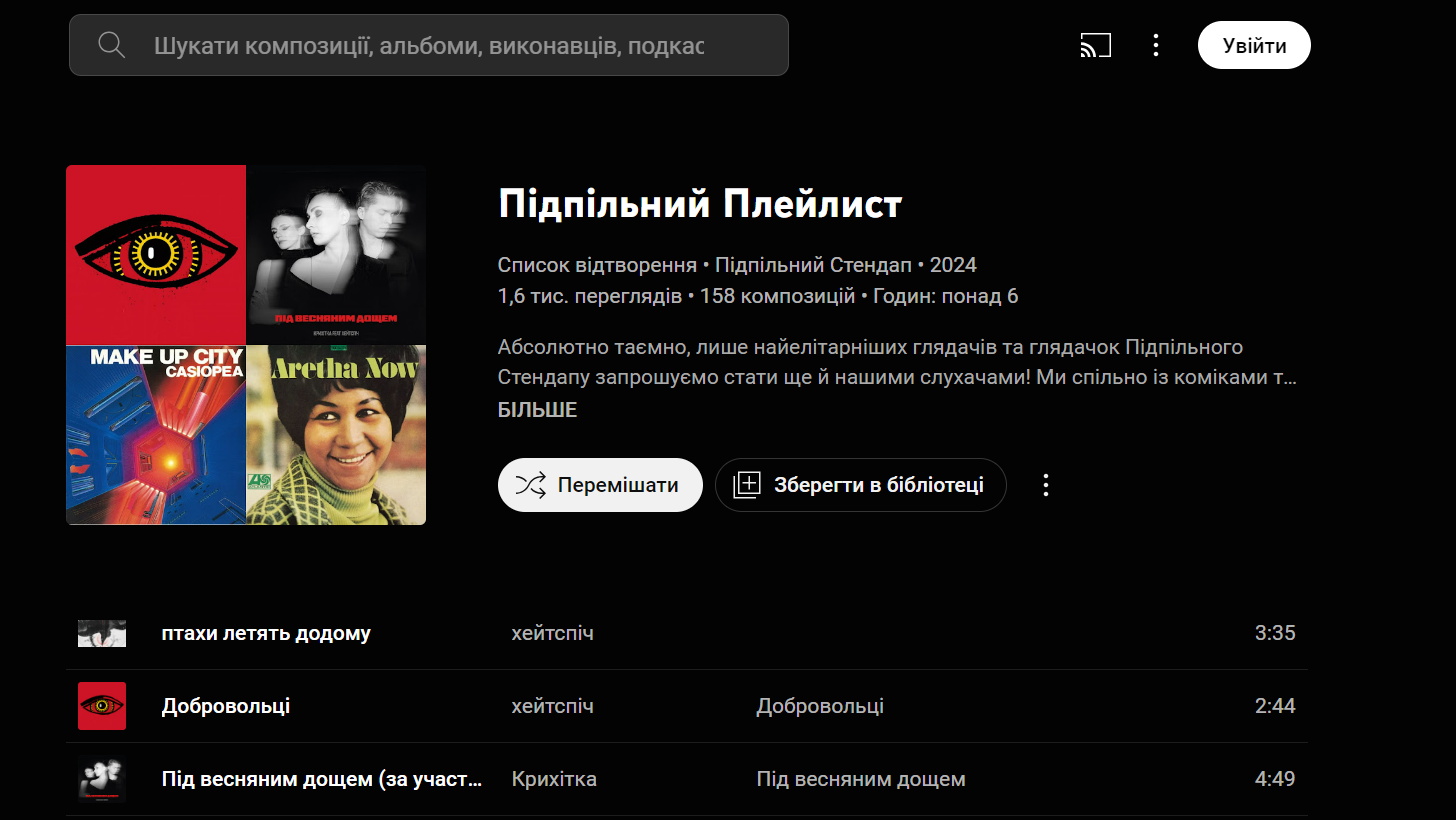 Загалом 25 сучасних українських коміків стендап-проєкту поділились музикою, яку вони слухають у дорозі, під яку виходять на сцену, надихаються, танцюють чи просто відпочивають. Додати собі плейлист можна за трьома посиланнями: YouTube Music, Apple Music та Spotify.