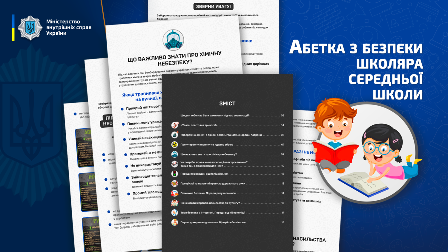 У посібнику для дітей є інформація про дії під час повітряної тривоги, небезпеку мін, бомб, гранат та снарядів, хімічну атаку, ядерну зброю, правила дорожнього руху, безпеку в Інтернеті. Книжка безкоштовна. Електронну версію можна подивитись тут.