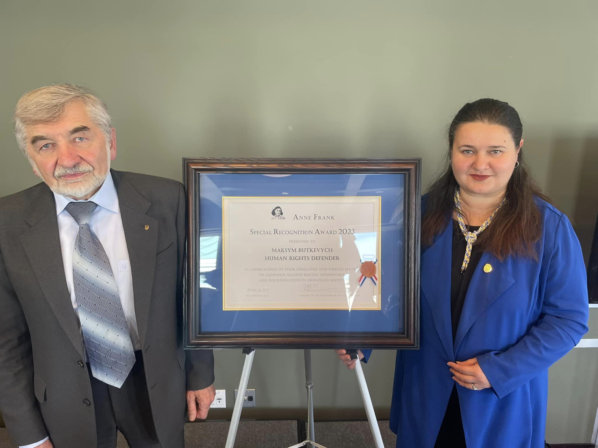 За вагомий внесок у боротьбу за права людини, проти антисемітизму, расизму та мови ворожнечі Посольство Нідерландів у США щороку вручає нагороду імені Анни Франк. Цьогоріч лауреатом став український правозахисник, журналіст, громадський діяч і військовослужбовець Максим Буткевич. Про це написала посолка України в США Оксана Маркарова. Нагороду приїхав отримати батько Максима, професор Олександр Буткевич.