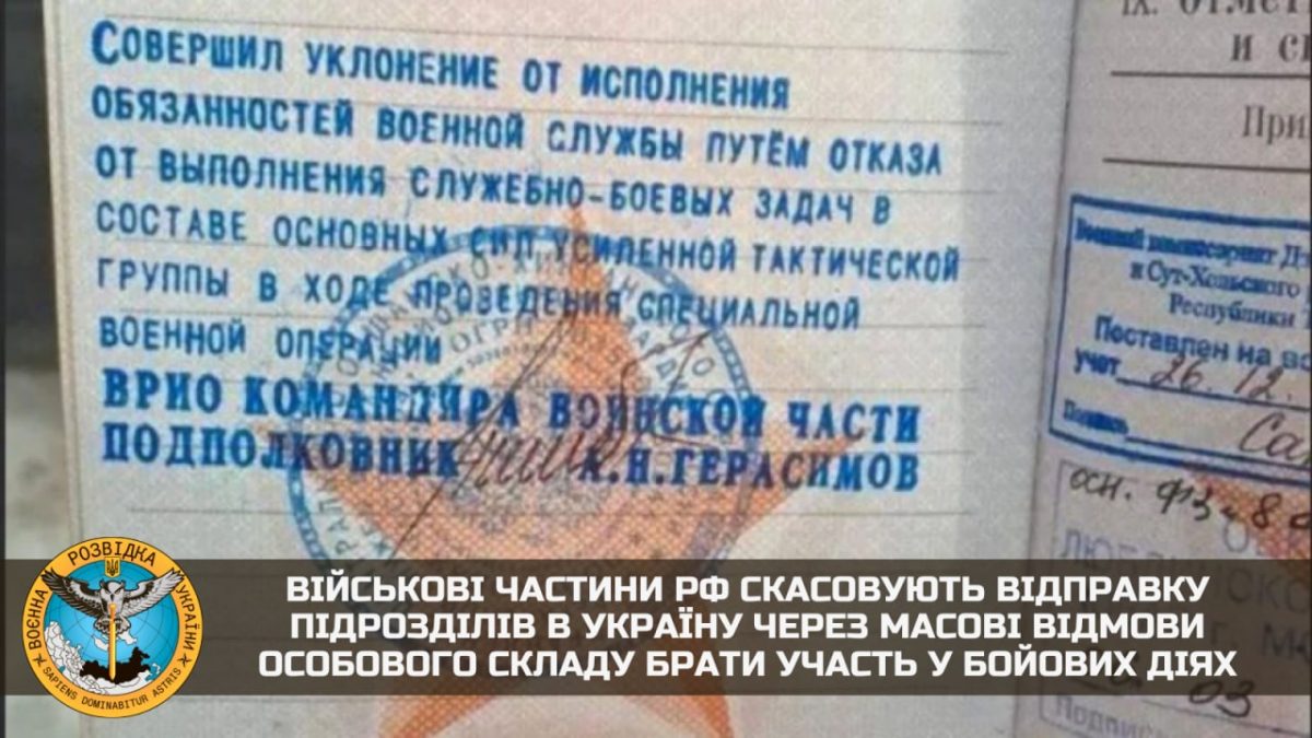 У частинах і з’єднаннях, які перебувають на території рф, скасовують відправки особового складу на війну в Україну. «Причина – масова відмова від участі в бойових діях», — йдеться у повідомленні від Головної управлінні розвідки Міноборони.