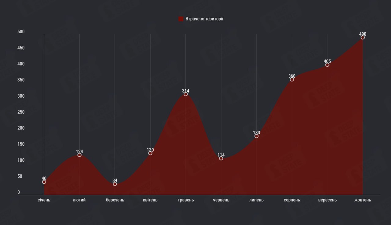За інформацією аналітиків моніторингового ресурсу DeepState, це найбільший показник за 2024 рік та за час російського наступу, який триває з жовтня 2023 року.