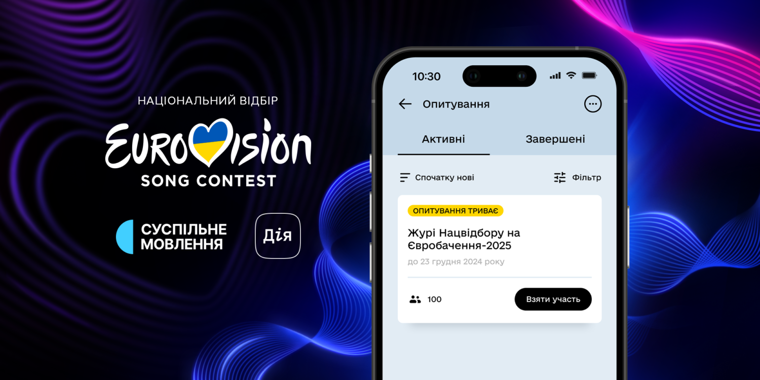 Суспільне Мовлення запустило опитування в «Дії», щоб українці обрали склад журі фіналу Національного відбору на Євробачення-2025. Опитування триватиме з 16 грудня до 23 грудня 2024 року. Взяти участь в опитуванні можуть всі охочі віком від 14 років. Для цього потрібно зайти в застосунок «Дія», в розділі «Сервіси» обрати «Опитування» та віддати свій голос за одного з кандидатів.