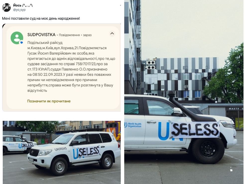 20 червня киянин Йосип Гусак отримав повістку до суду за «дрібне хуліганство». Раніше, після підриву РФ Каховської ГЕС, хлопець наклеїв плакати зі словом «Useless» (непотрібний) на автомобілі ООН.