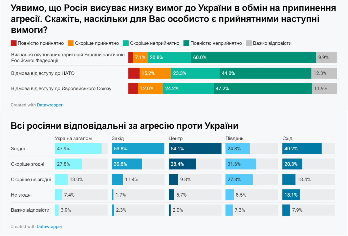 Ба більше, РФ не приховує своїх справжніх намірів. Не лише російські пропагандисти, але і високопосадовці, включно із самим Владіміром Путіним, заявляють, що саме існування України вони вважають помилкою. Президент РФ якось заявляв, що вважає розпад СРСР «найбільшою геополітичною катастрофою XX століття». У своїй статті, яку Путін оприлюднив за декілька місяців до повномасштабного вторгнення, він прямо стверджував, що, на його думку, України насправді не існує, і що більшовики «подарували Україні територію». Якщо президент РФ хоче відновити СРСР, то йому для цього йому потрібна українська земля, незважаючи на жодні побажання і уявлення українців. Чи ж не є доказом серйозності намірів Путіна репресії проти українських активістів, заміна українських громадян росіянами і заборона всього українського на окупованих територіях? Хіба ж заклики прийняти російські «правила» призведуть до хоч чогось хорошого?