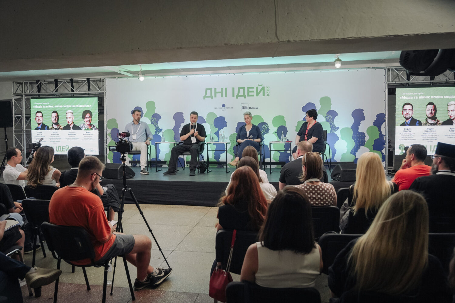 У фокусі першої панельної дискусії Дня Ідей був вплив медіа на свідомість. У дискусії взяли участь журналіст Вадим Карп’як, телеведуча і театральна продюсерка Ярослава Кравченко та керівник Центру протидії дезінформації Андрій Коваленко. Модераторкою панельної дискусії була консультантка зі стратегічних та кризових комунікацій Ярина Ключковська.
