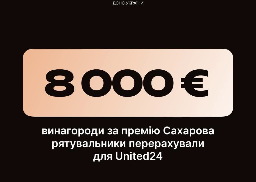 Рятувальники Державної служби з надзвичайних ситуацій переказали для United24 Європарламентську премію імені Сахарова, яку отримав торік народ України в особі Володимира Зеленського, громадянського суспільства та працівників ДСНС — 8 тисяч євро (приблизно 320 тисяч гривень).