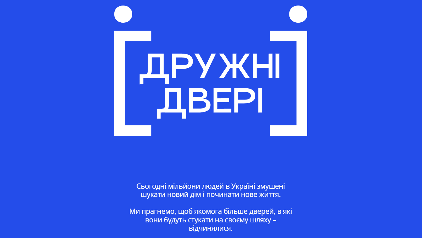 Громадська організація «Не Самі» та креативна агенція Bickerstaff.092 запустили проєкт «Дружні Двері». Ініціатива має на меті допомогти українцям, які вимушено покинули домівки через російську агресію, адаптуватися в нових громадах та знайти підтримку серед бізнесу та місцевих ініціатив.